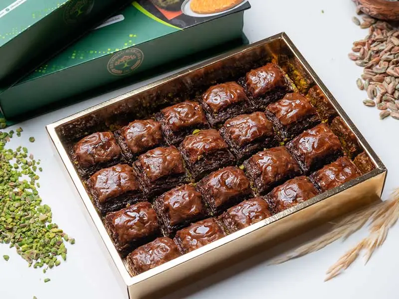 A decadent twist on a classic, this baklava infuses the timeless layers of crispy phyllo pastry with a rich, velvety chocolate essence. Tucked within these layers are finely chopped pistachios, adding a nutty depth and satisfying crunch. Each piece is then bathed in a sweet syrup, harmonizing the chocolate’s bittersweet notes with the natural sweetness of the nuts. Ideal for chocolate lovers and traditional baklava enthusiasts alike, this dessert offers a luxurious and indulgent experience.